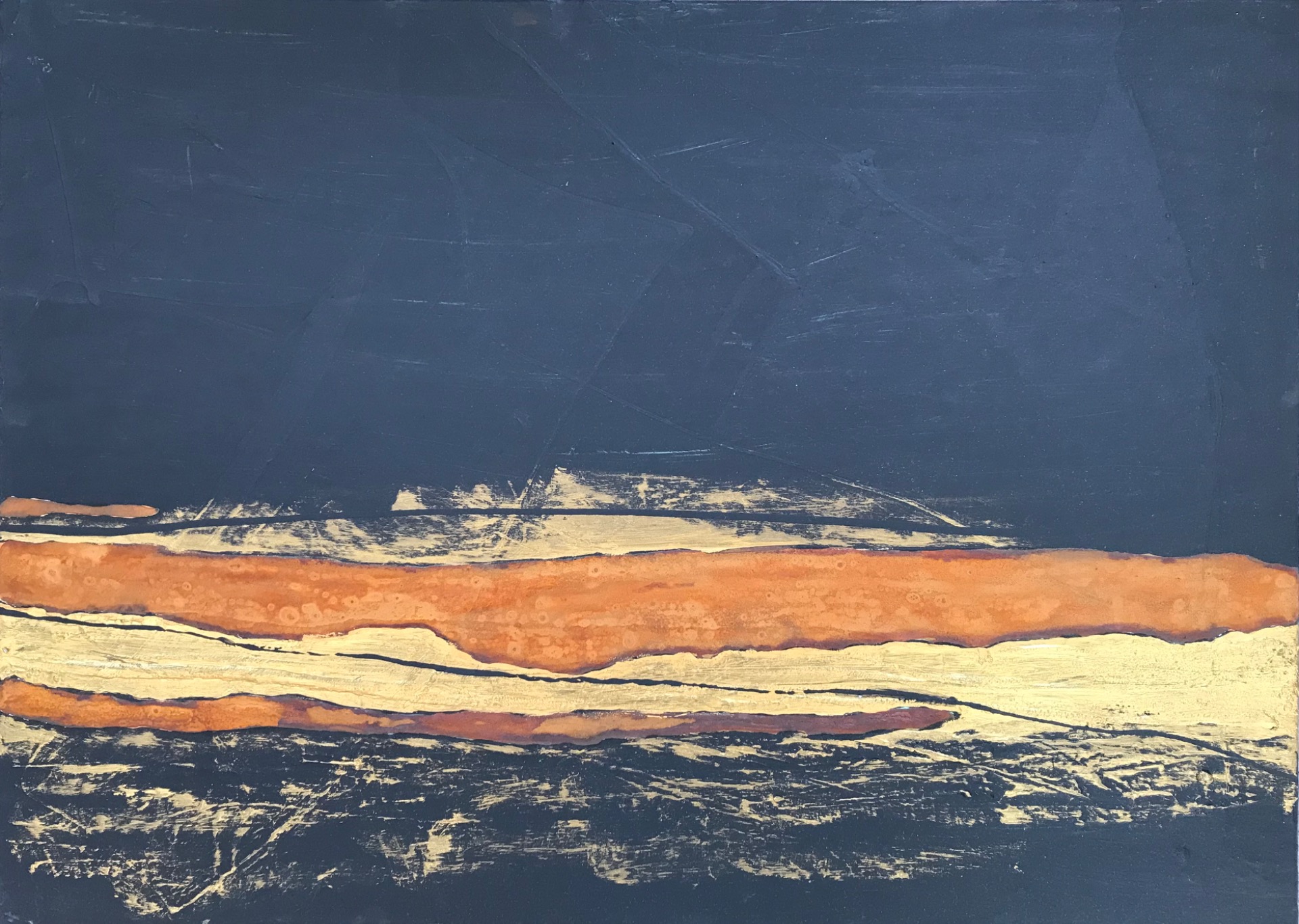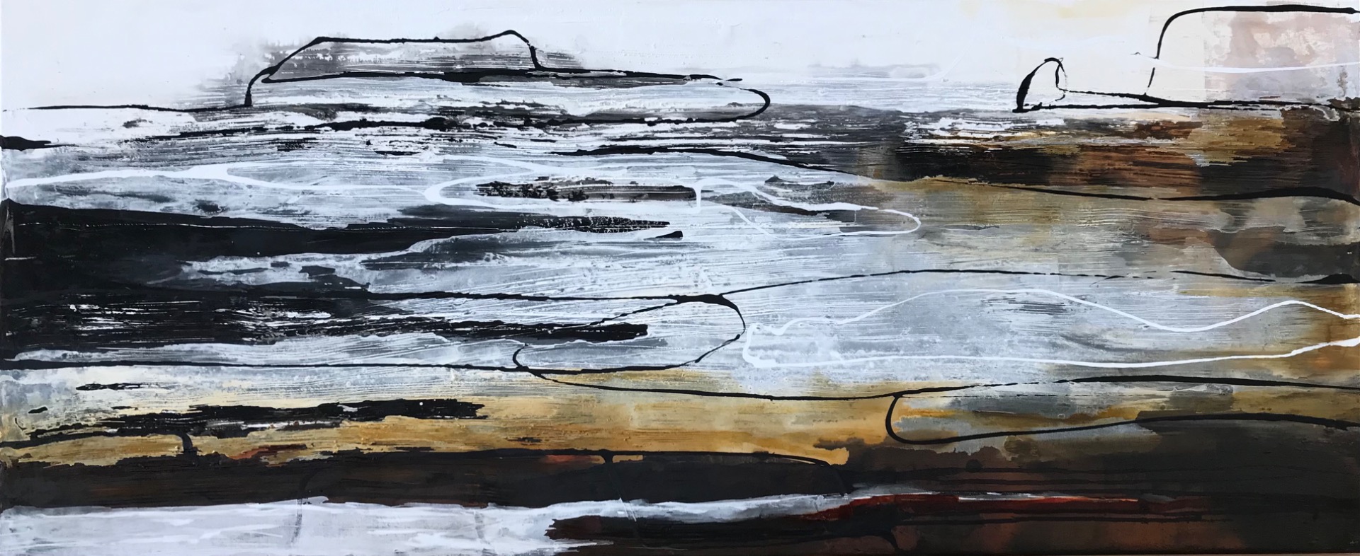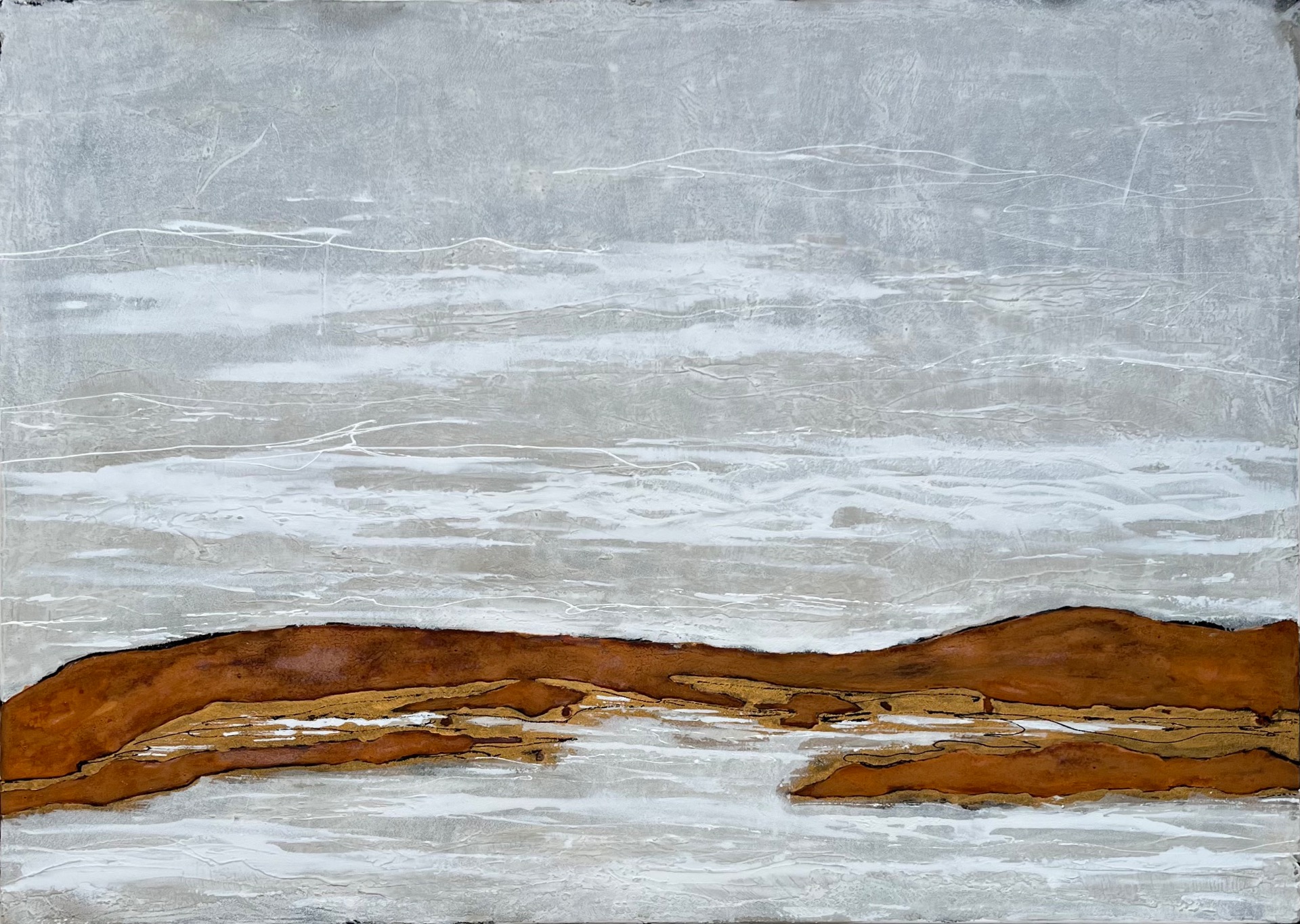 90x30 Rost, Kupferpatina, Kaffeesatz, Acryl auf Leinwand